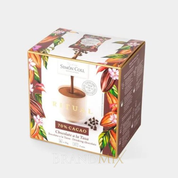 Simon Coll Spanyol forrócsokoládé. A Ritual 70% kakaó, 100% kakaóbabból készül, kevesebb cukorral és zsírtalanított a csokoládépor. Minden csomag 6 db csomagolt csokoládéport tartalmaz.