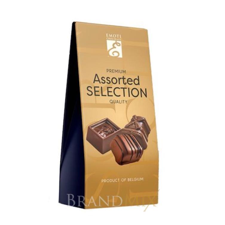 Prémium Belga tej- és étcsokoládé marcipán és mogyoró töltelékkel. Papírdobozban.