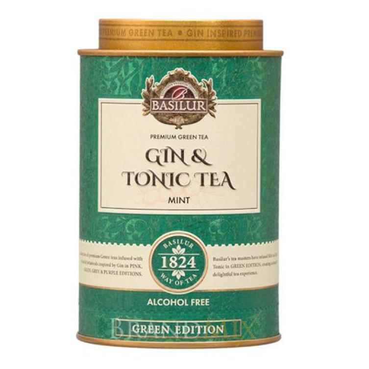 Basilur Ceylon szálas zöld tea borókabogyóval, citromfüves gin ízzel, tonik ízzel, lime-menta ízzel. Elegáns henger alakú fémdobozban.