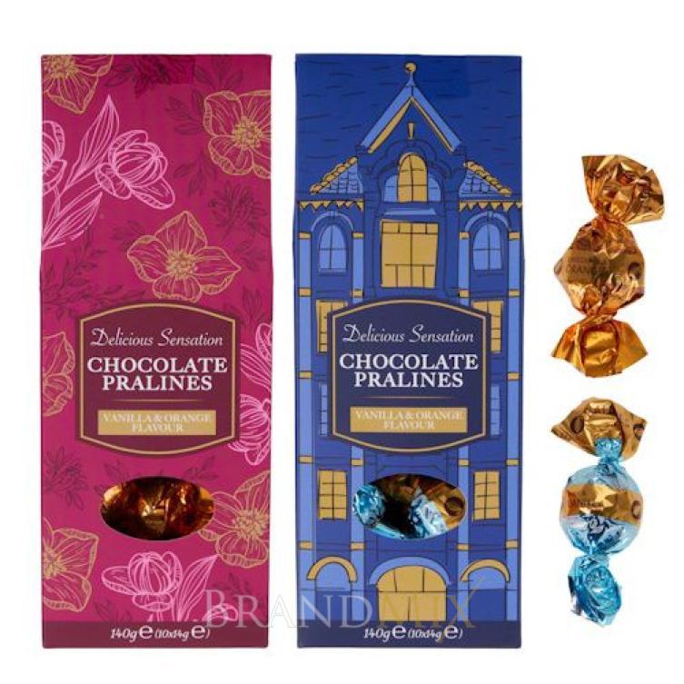 Becky's alkoholos praniné, vanília-narancs ízesítésű töltelékkel, házikó formájú papírdobozban.