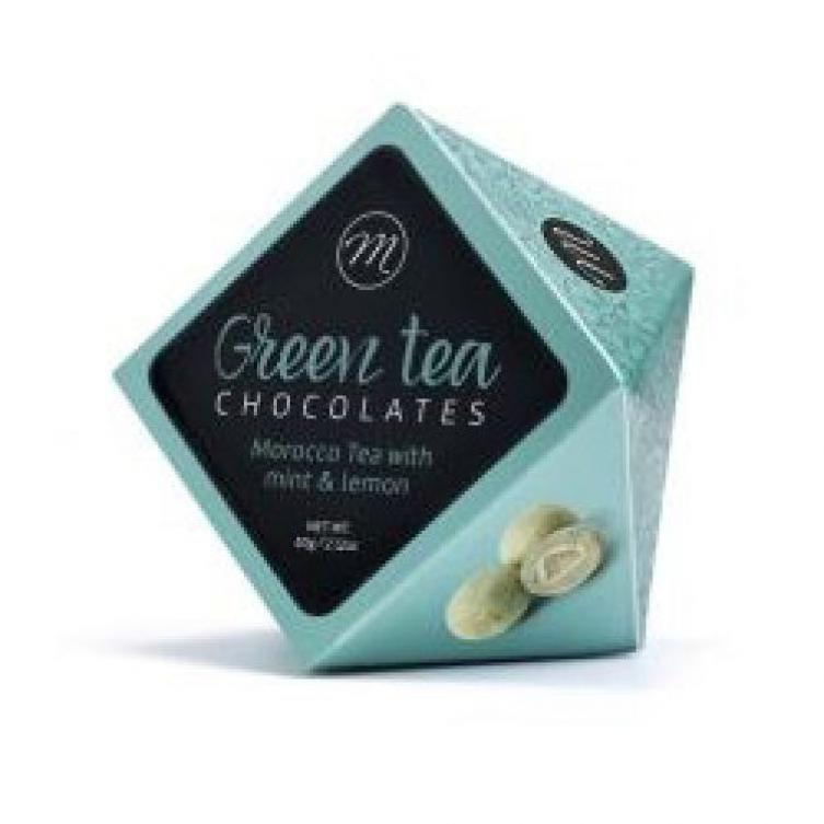 Prémium minőségű spanyol fehér csokoládés drazsé, marokkói zöld teával ízesítve, elegáns gyémánt formájú papírdobozban.