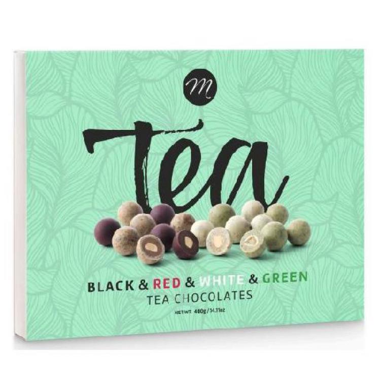 Prémium minőségű spanyol csokoládés drazsé, vörös teával, fekete teával, zöldteával és fehér teával ízesítve, elegáns papírdobozban./