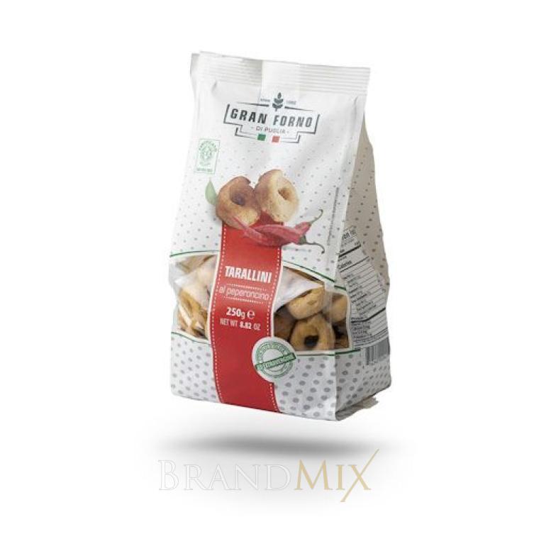 A Tarallini al peperoncino apró, ropogós, sós karikák chilivel. Tipikus olasz specialitás Puglia régiójából, búzalisztből, extra szűz olívaolajból és fehérborból készül. Finom falat borral vagy sörrel. Olaszországban az aperitivó során fogyasztják, ami e
